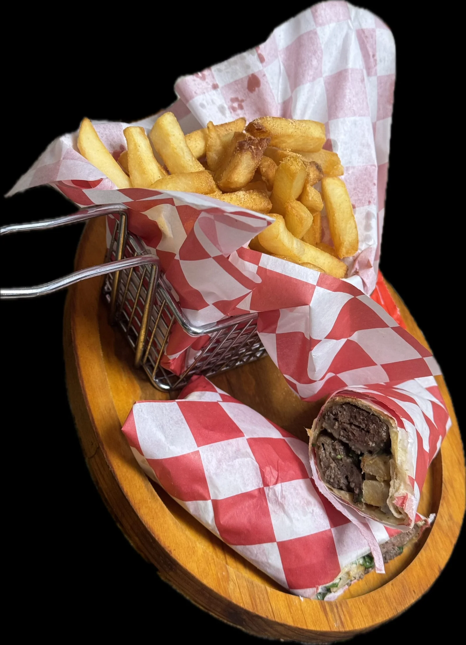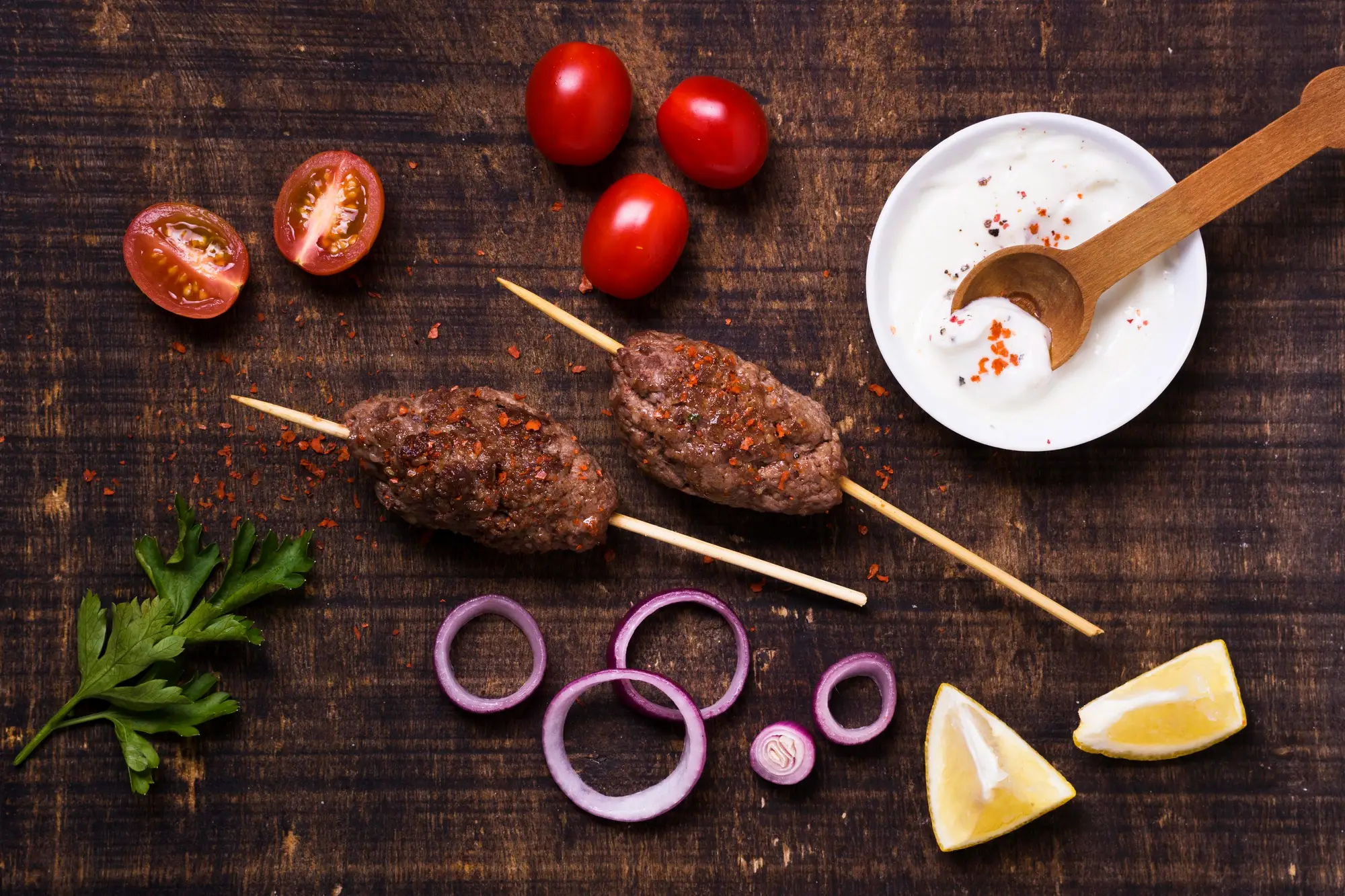 Ground beef and onions grilled to perfection wrapped in pita with parsley with tahini sauce