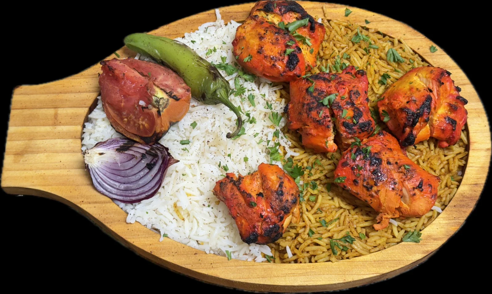 Marinated chicken cubes grilled to perfection, served with basmati rice, small salad, choice of sautéed spinach or stewed chickpeas and naan bread