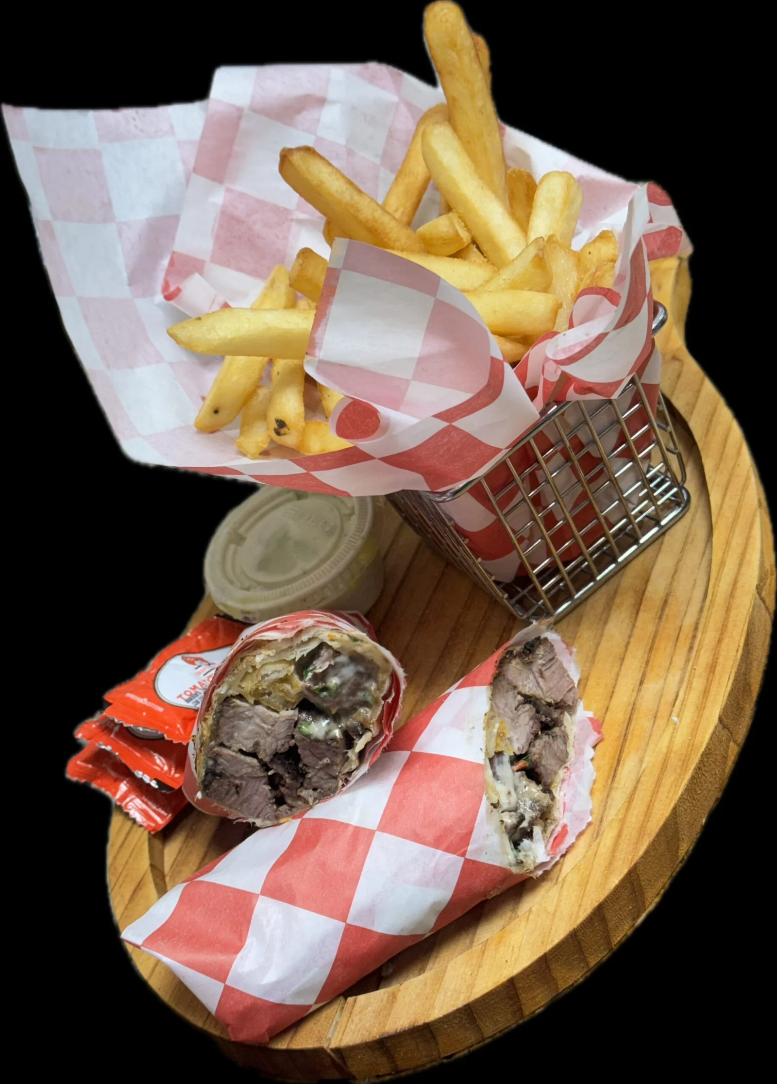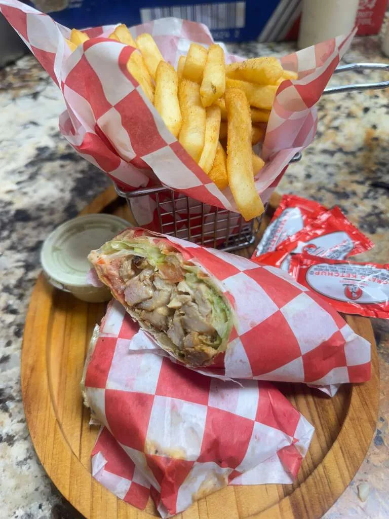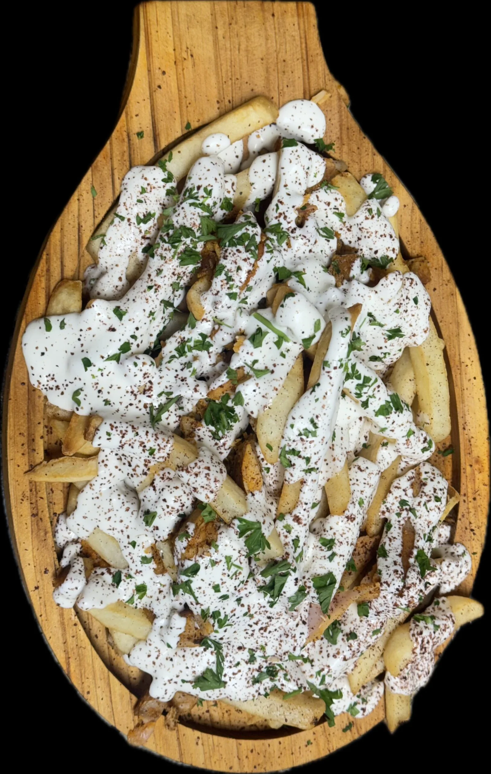 Seasoned fries mixed with shawarma and garlic sauce