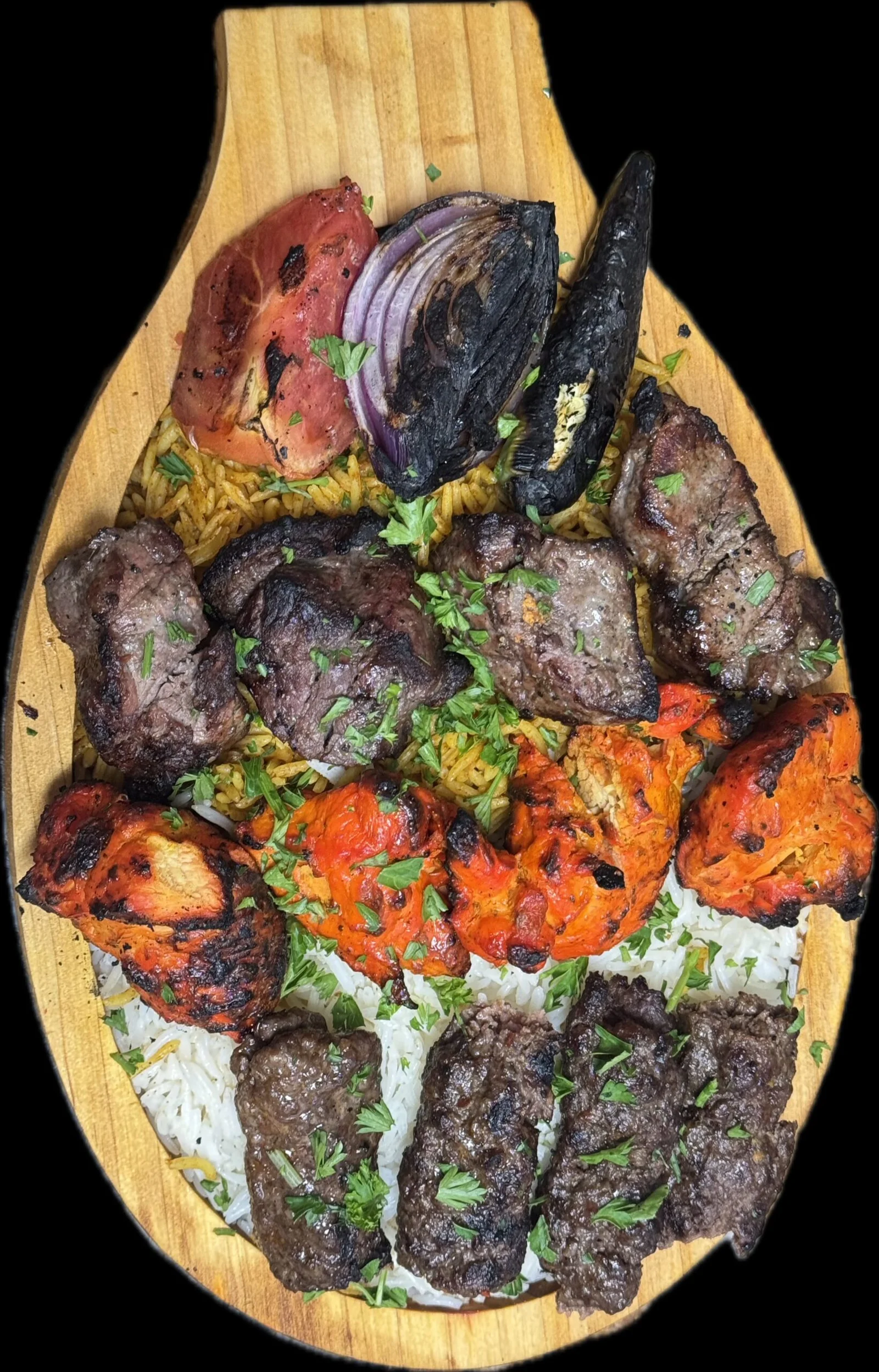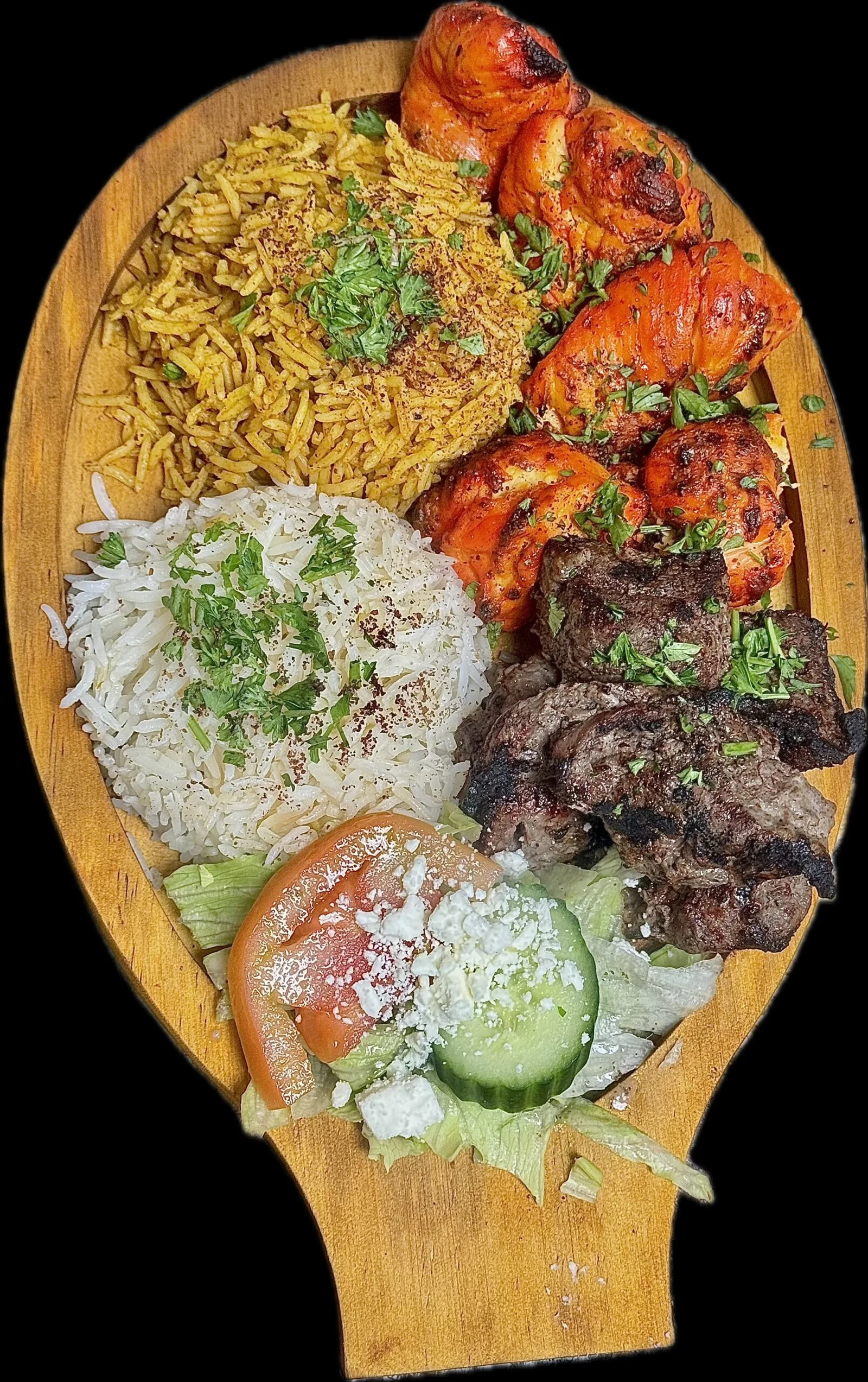 Grilled chicken, lamb and ground beef with special seasonings, served with basmati rice, small salad, choice of sautéed spinach or stewed chickpeas and naan bread