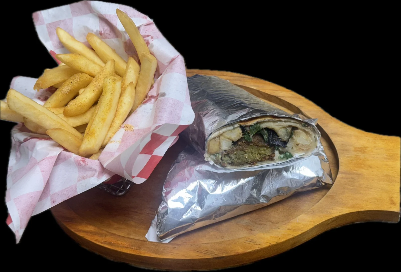 Chickpea croquettes wrapped in pita with hummus, tahini, lettuce, tomato and pickles