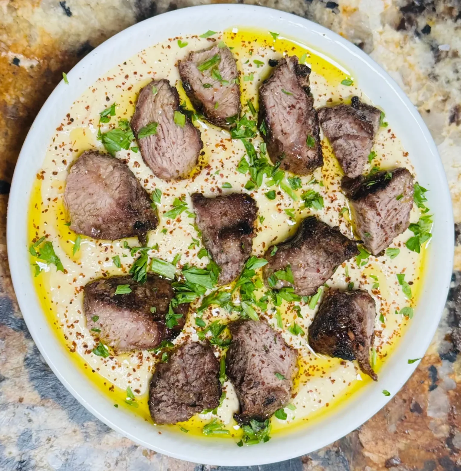 Traditional chickpea dip with tahini, lemon, oil and garlic served with pita bread and shawarma chicken