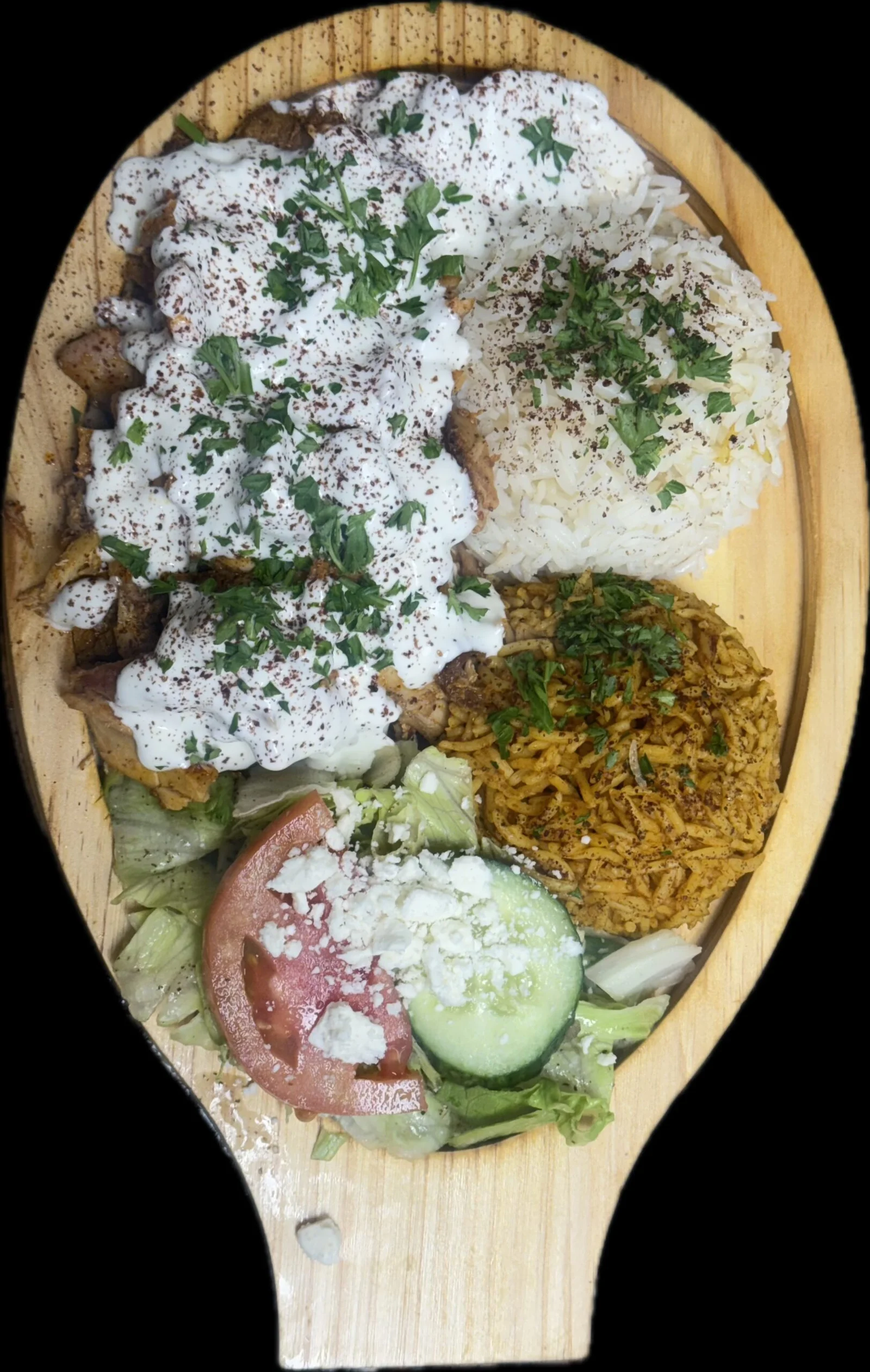 Vertical roasted sliced marinated chicken on bed of basmati rice, served with fattoush salad, garlic sauce, and naan bread. Served with your choice of chickpeas or spinach.